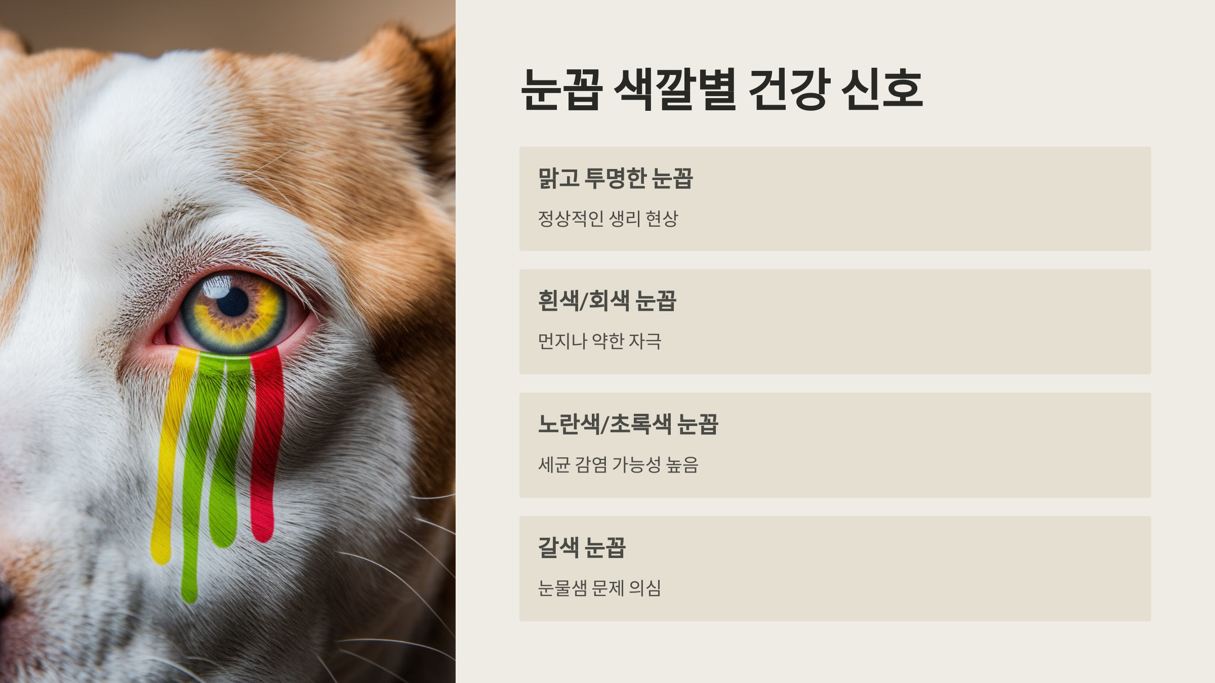 - 갈색 눈꼽: 눈물 자국과 함께 나타날 경우 눈물샘 문제 의심