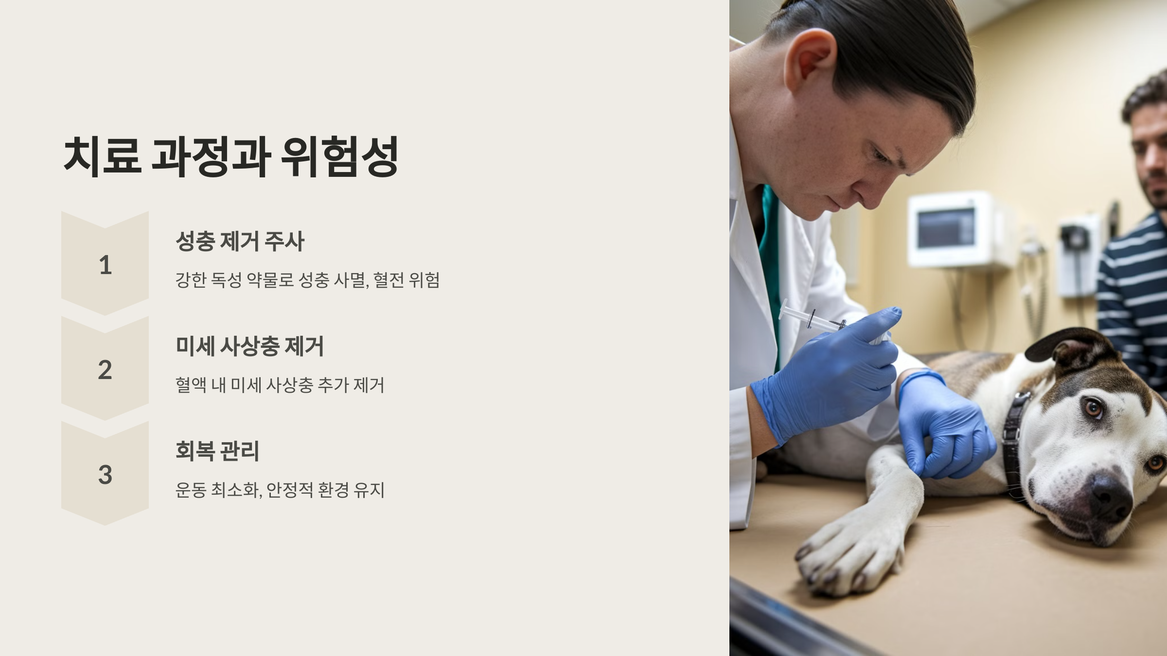 - 이 과정에서 면역 반응이 발생할 수 있어 수의사의 관리가 필요합니다.