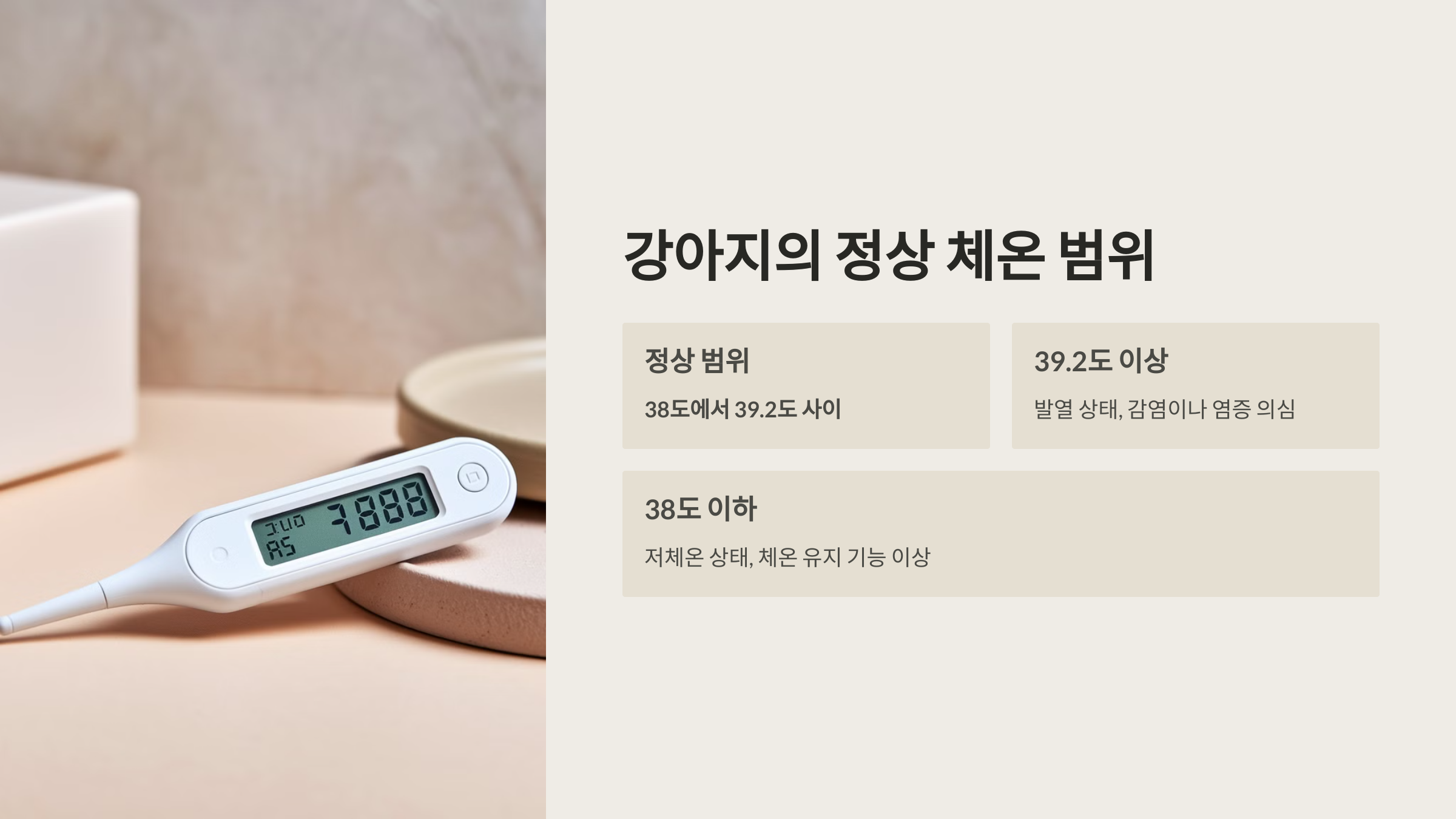 강아지의 정상 체온은 보통 38도에서 39.2도 사이로, 사람보다 다소 높은 편입니다. 강아지의 신체 구조와 대사율이 사람과 다르기 때문에 이러한 체온 차이가 발생합니다. 만약 강아지의 체온이 이 범위를 벗어나면 건강 이상을 의심해 볼 필요가 있습니다.
