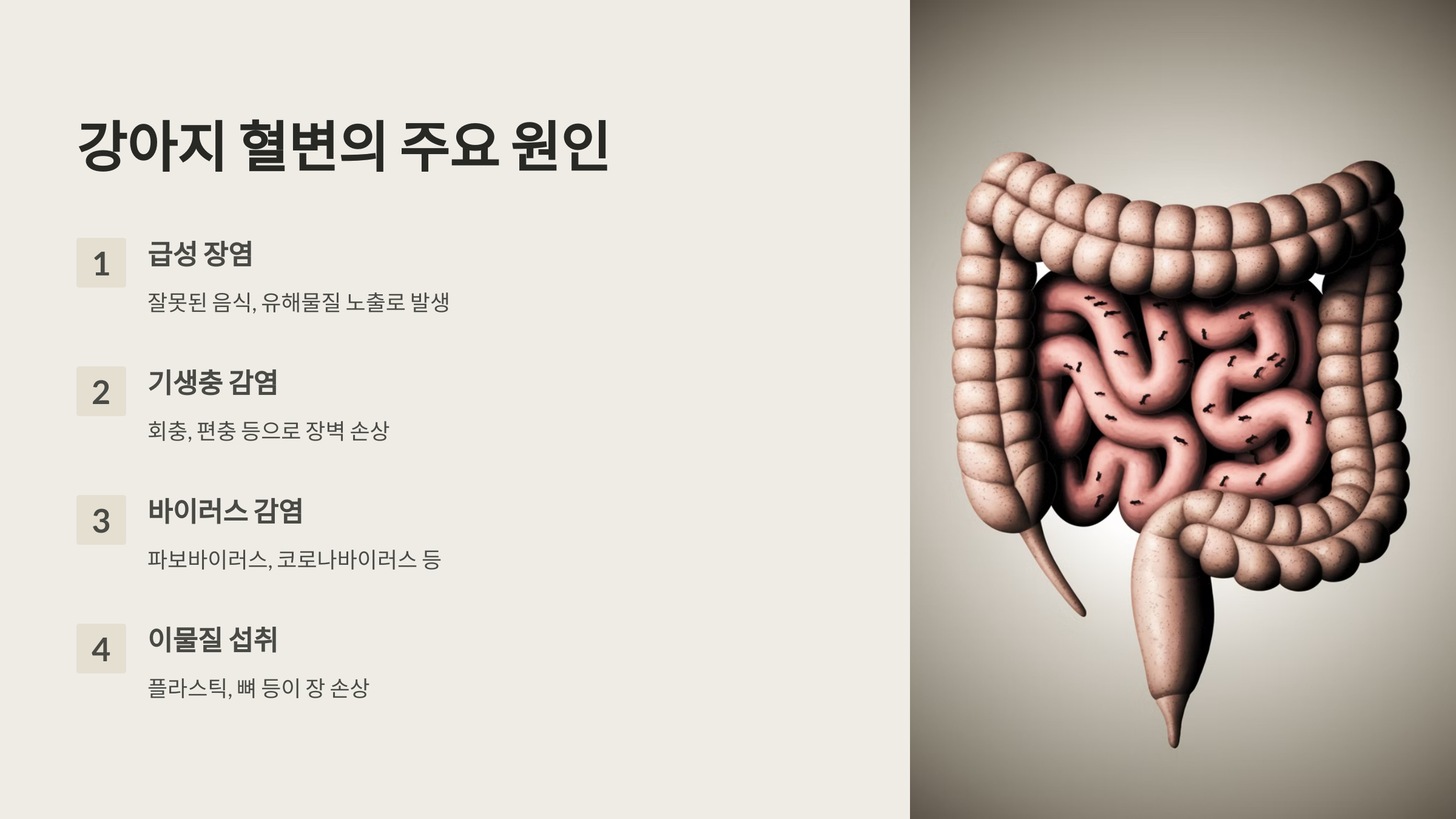 강아지의 혈변은 여러 가지 원인으로 발생할 수 있다. 가장 흔한 원인은 장내 염증이나 감염이며, 심한 경우 장출혈이나 종양일 가능성도 있다.