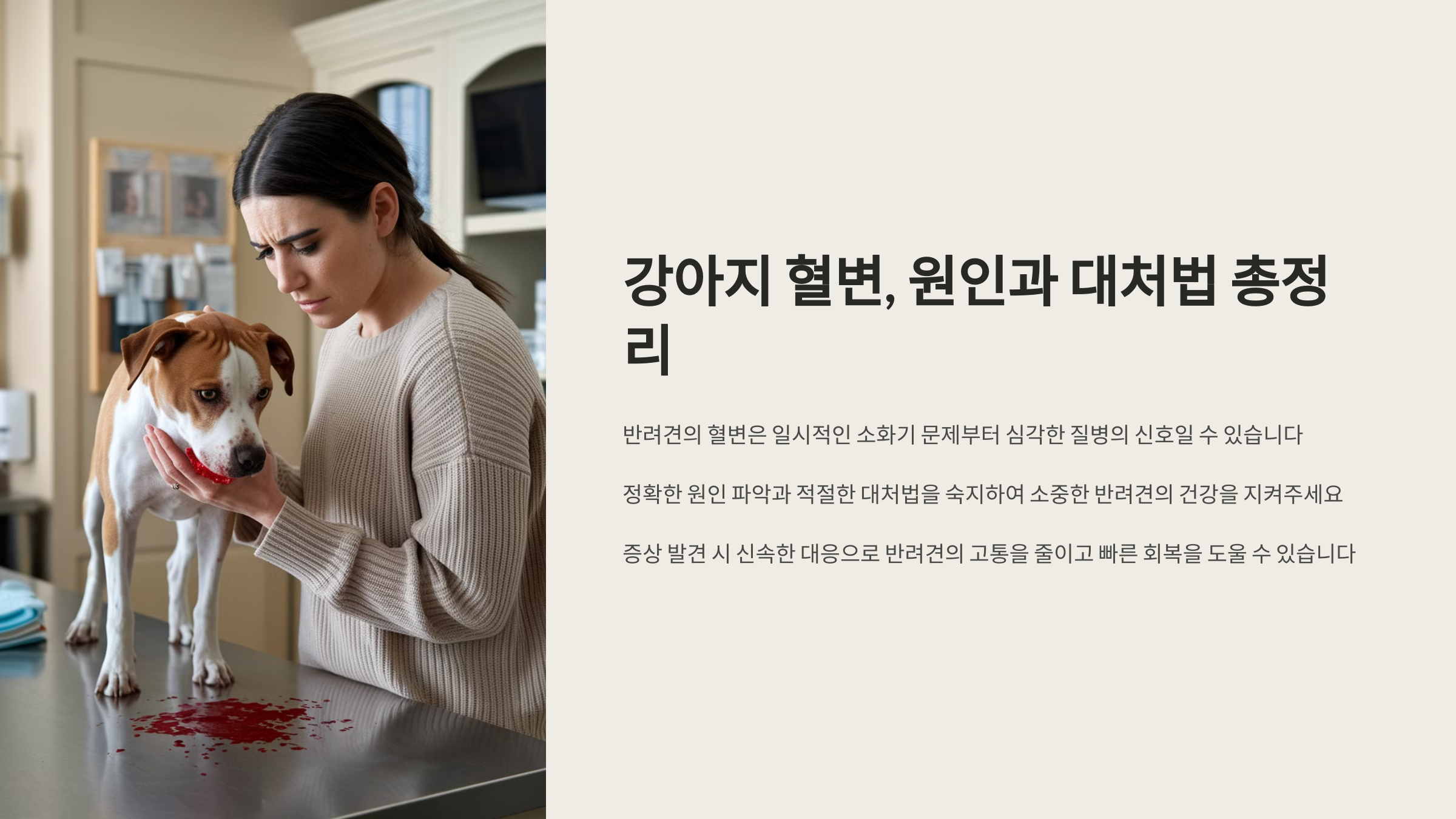 강아지의 혈변은 단순한 장염부터 심각한 질환까지 다양한 원인에 의해 발생할 수 있다. 보호자는 혈변의 형태와 강아지의 상태를 면밀히 관찰하고, 필요한 경우 신속하게 수의사에게 상담해야 한다. 반려견이 건강하게 생활할 수 있도록 올바른 식단과 환경을 유지하는 것이 중요하다.
