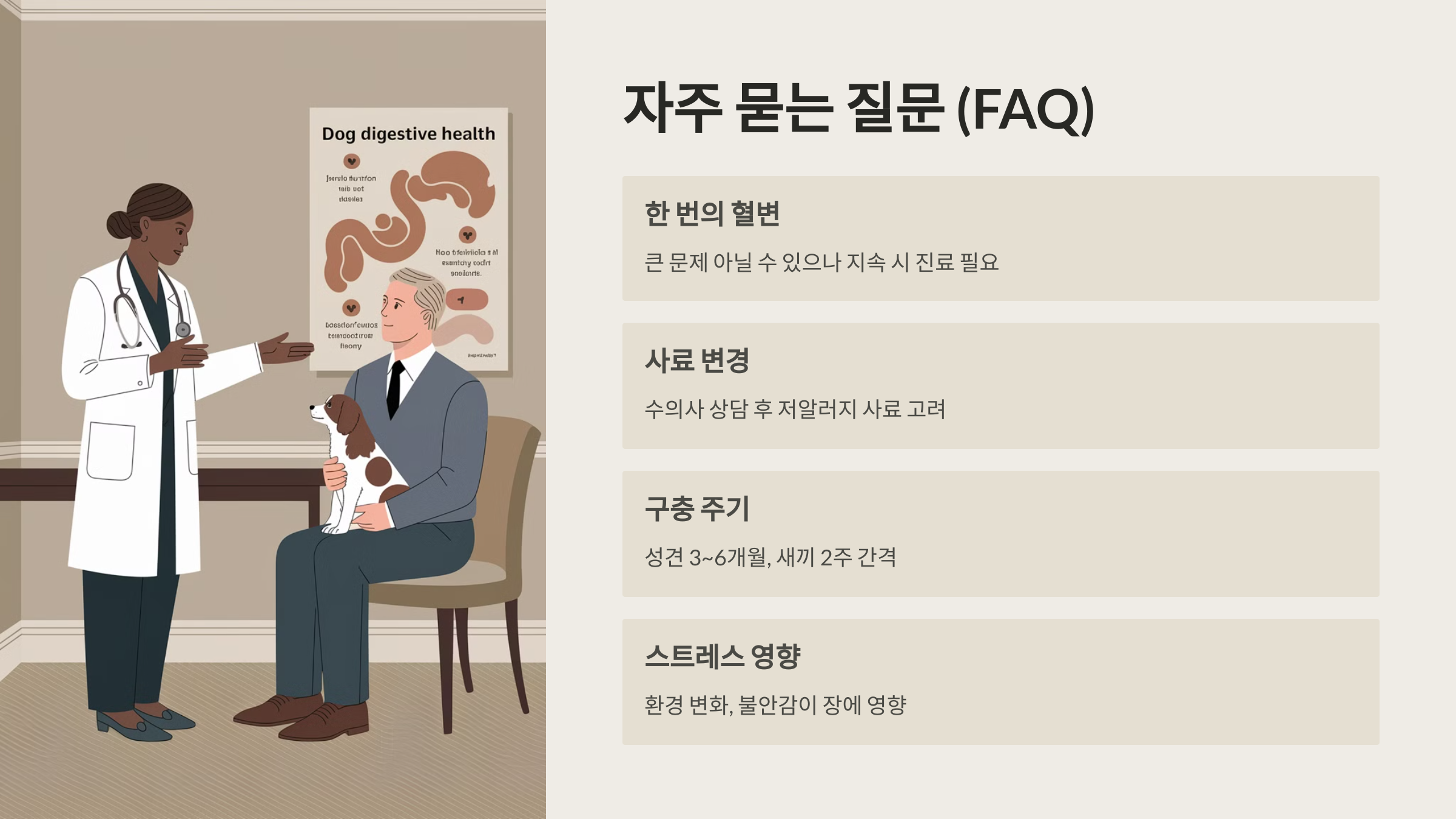 한 번 정도의 혈변은 큰 문제가 아닐 수 있지만, 지속되거나 다른 증상이 동반되면 수의사의 진료가 필요합니다.